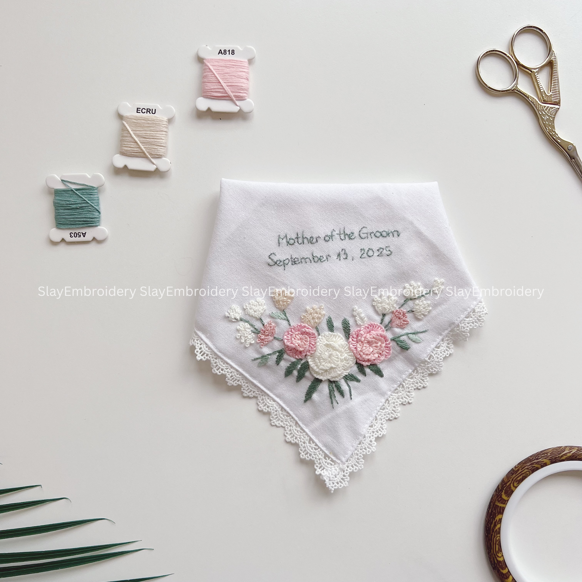 3D Pink Roses Wedding Handkerchief, Custom Embroidered Handkerchief, Linen Handkerchiefs