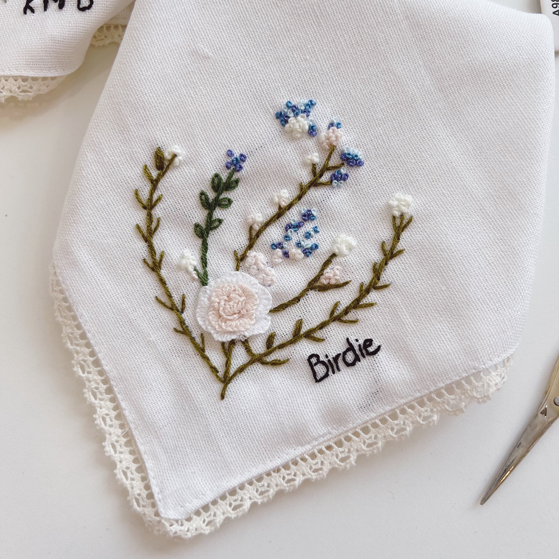 3D Rose Wild Flowers Wedding Handkerchief, Custom Embroidered Handkerchief, Linen Handkerchiefs