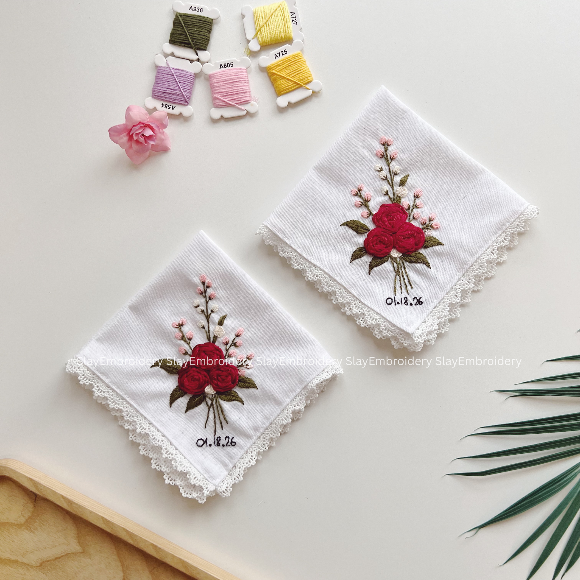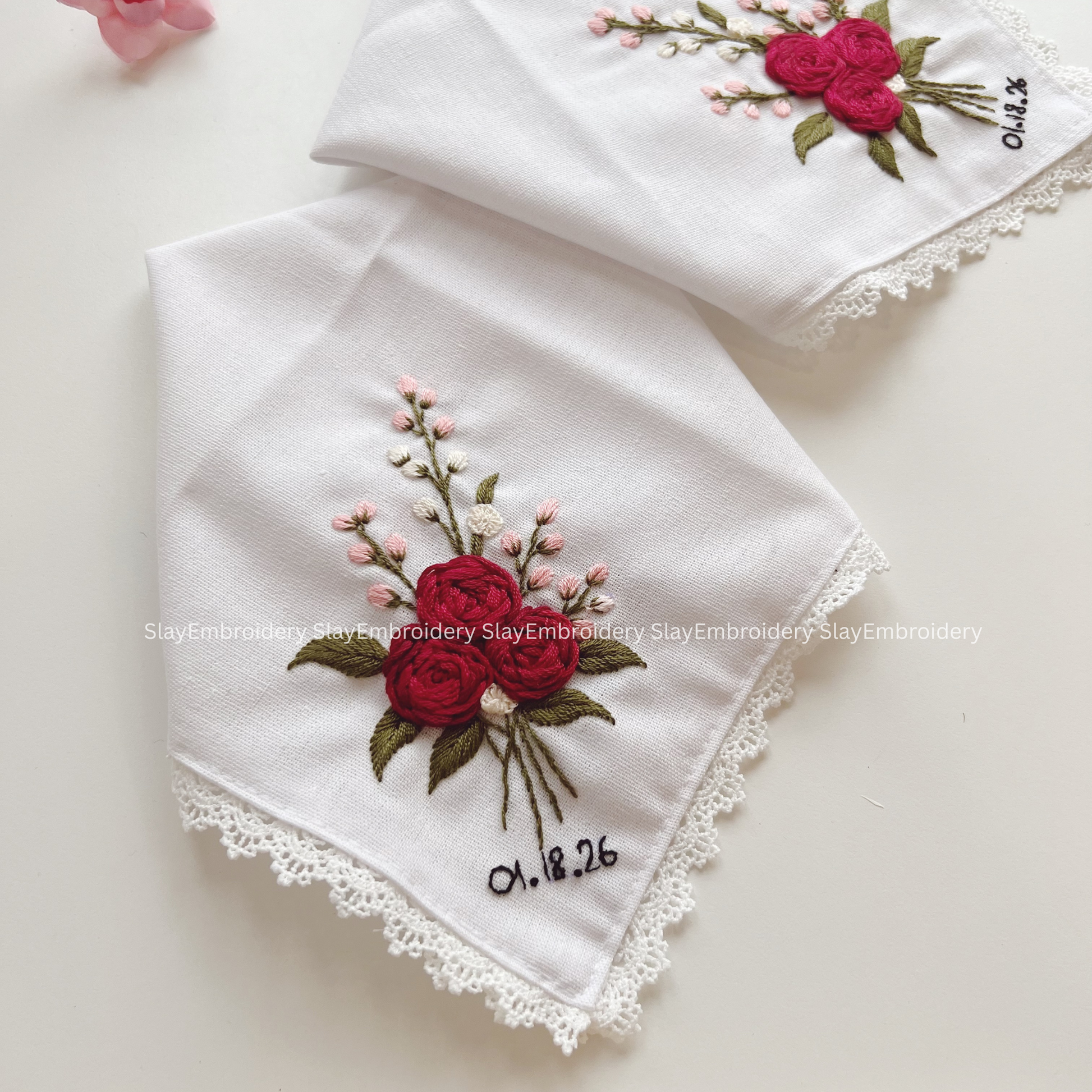 Wild Rose Kiss Wedding Handkerchief, Custom Embroidered Handkerchief, Linen Handkerchiefs