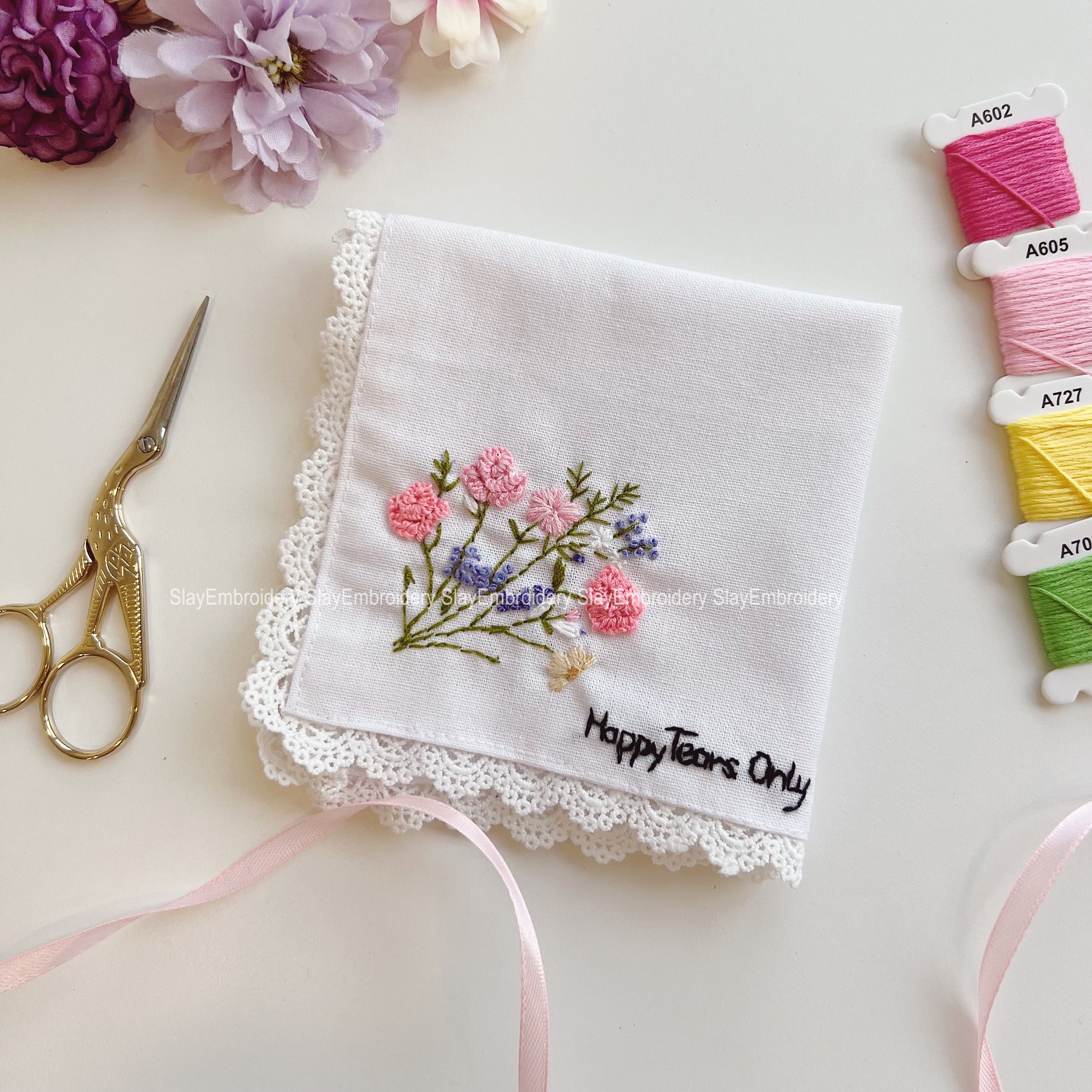 3D Rosed Flowers Blush Garden Dreams Wedding Handkerchief, Custom Embroidered Handkerchief, Linen Handkerchiefs