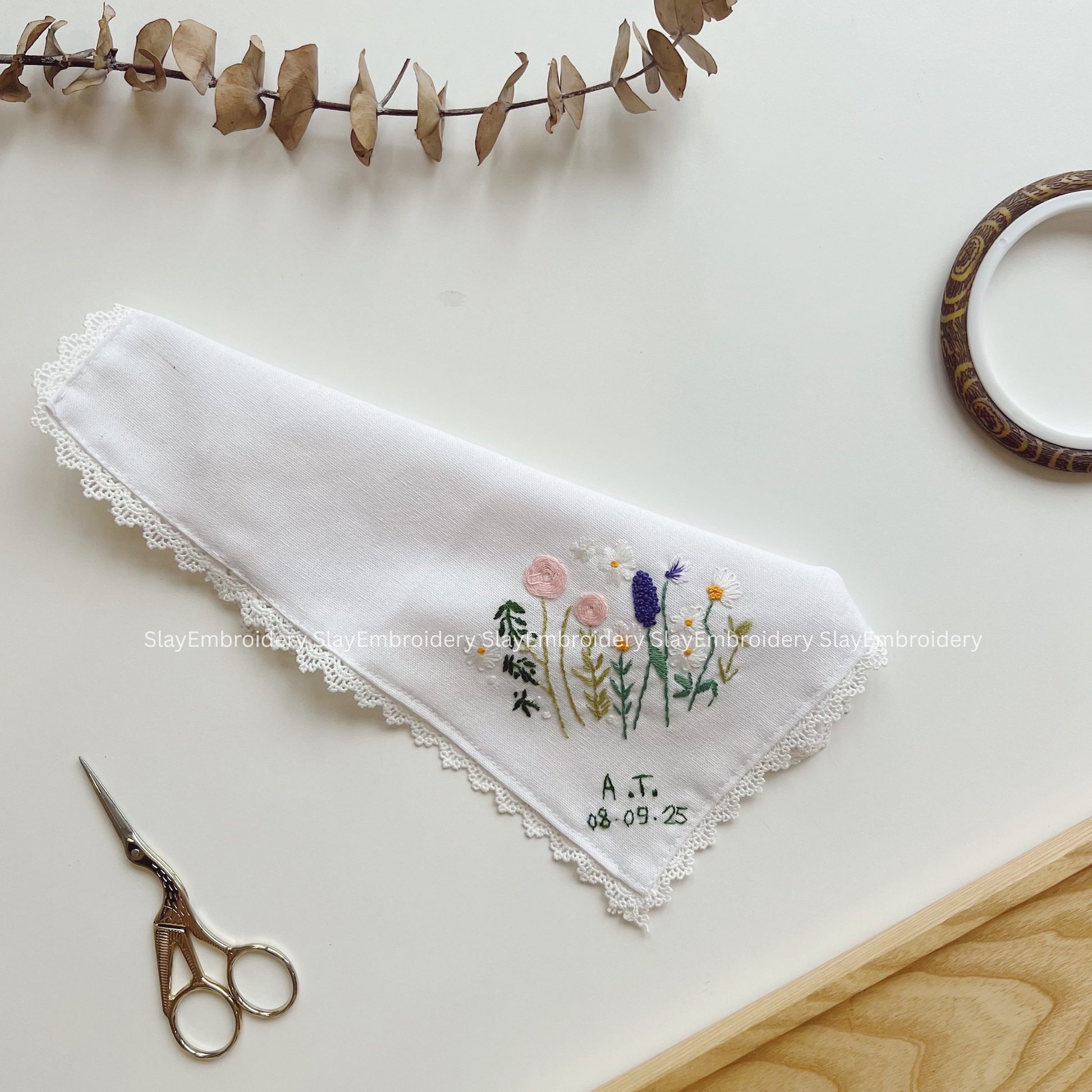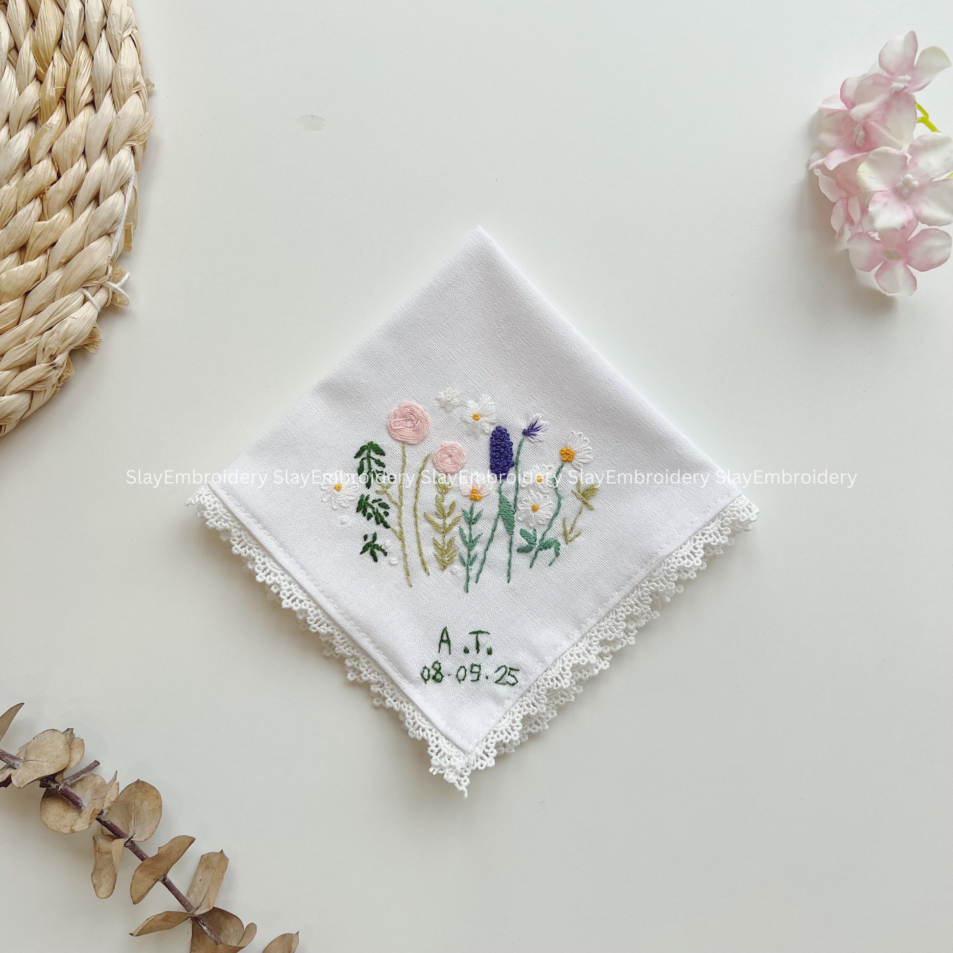 Pastel Field Wedding Handkerchief, Custom Embroidered Handkerchief, Linen Handkerchiefs