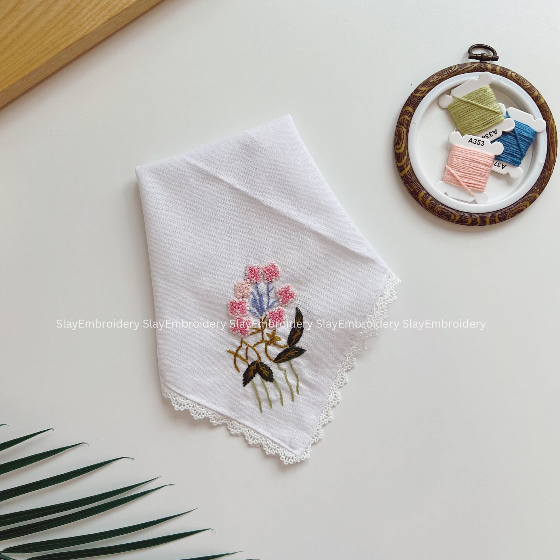 Pink Flower Wedding Handkerchief, Custom Embroidered Handkerchief, Linen Handkerchiefs