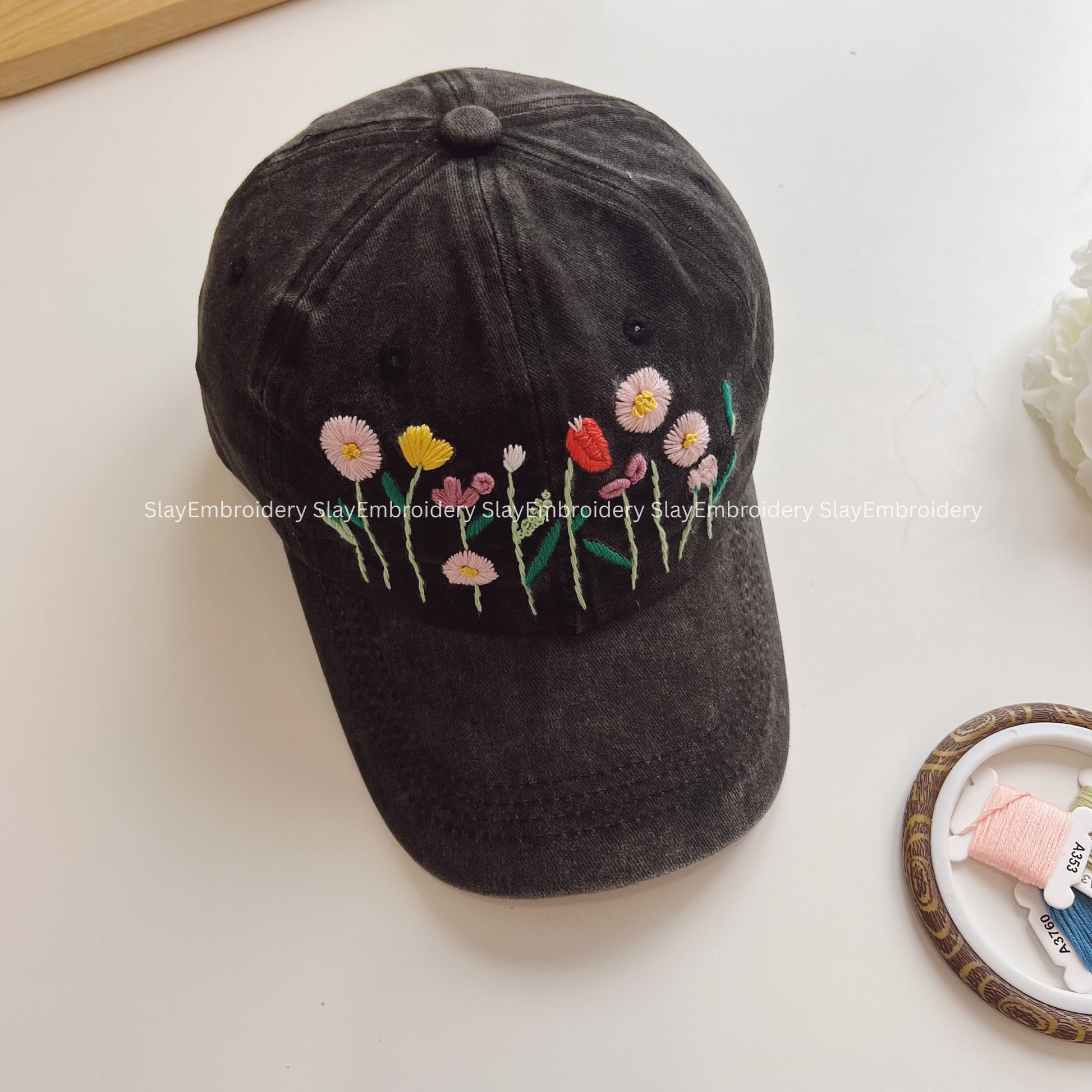 Floral Whispers Summer Hand Embroidery Hat Vintage Hat Washed Baseball Cap