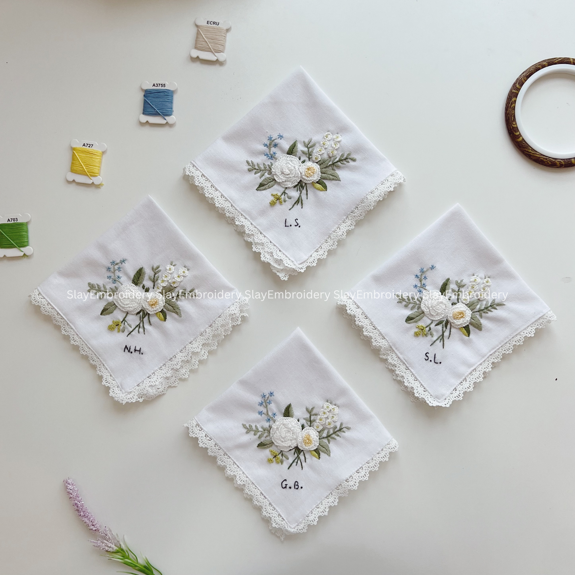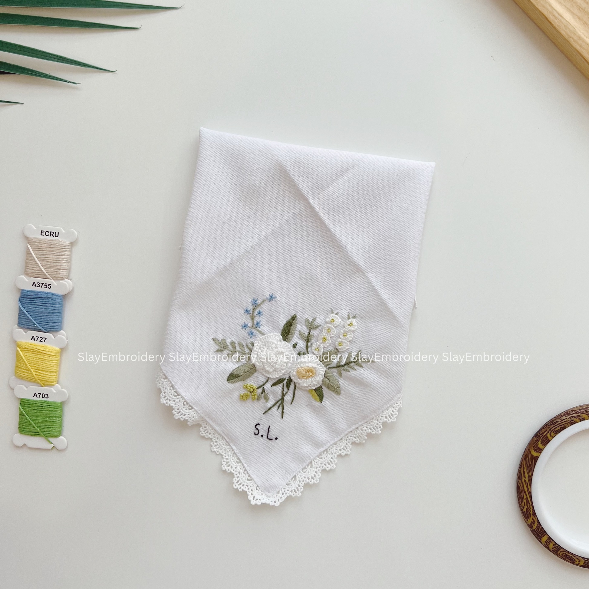 White Bloom Glow Wedding Handkerchief, Custom Embroidered Handkerchief, Linen Handkerchiefs