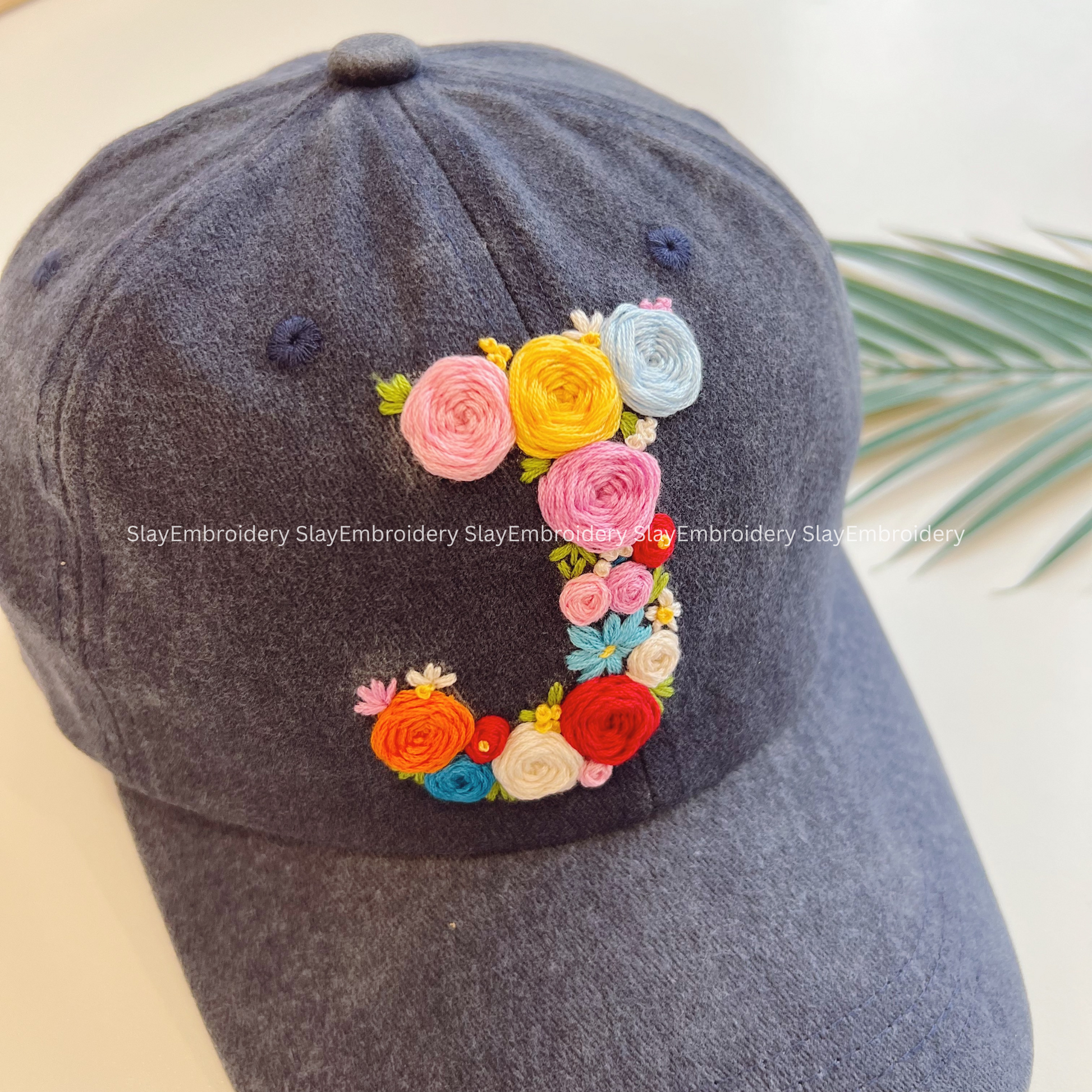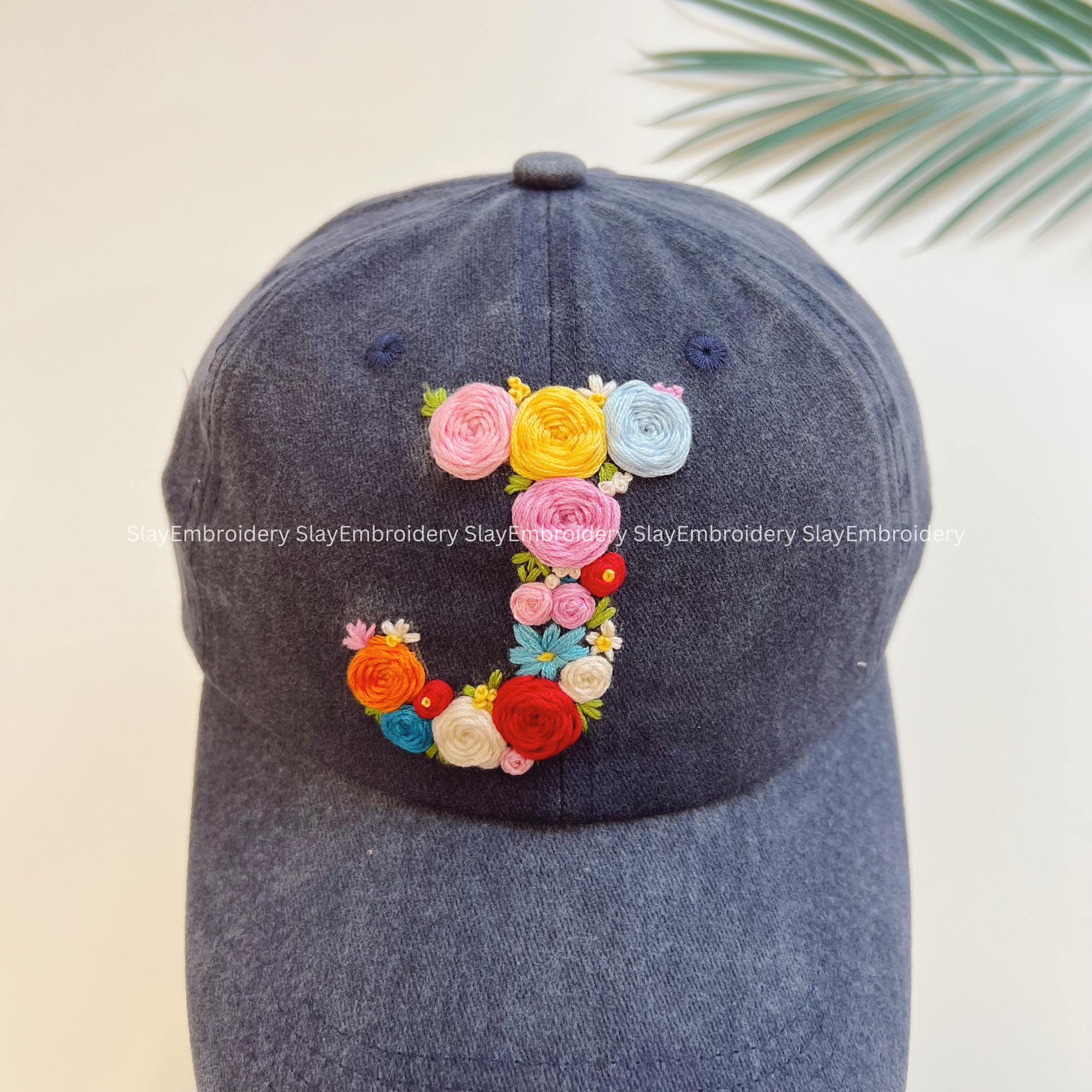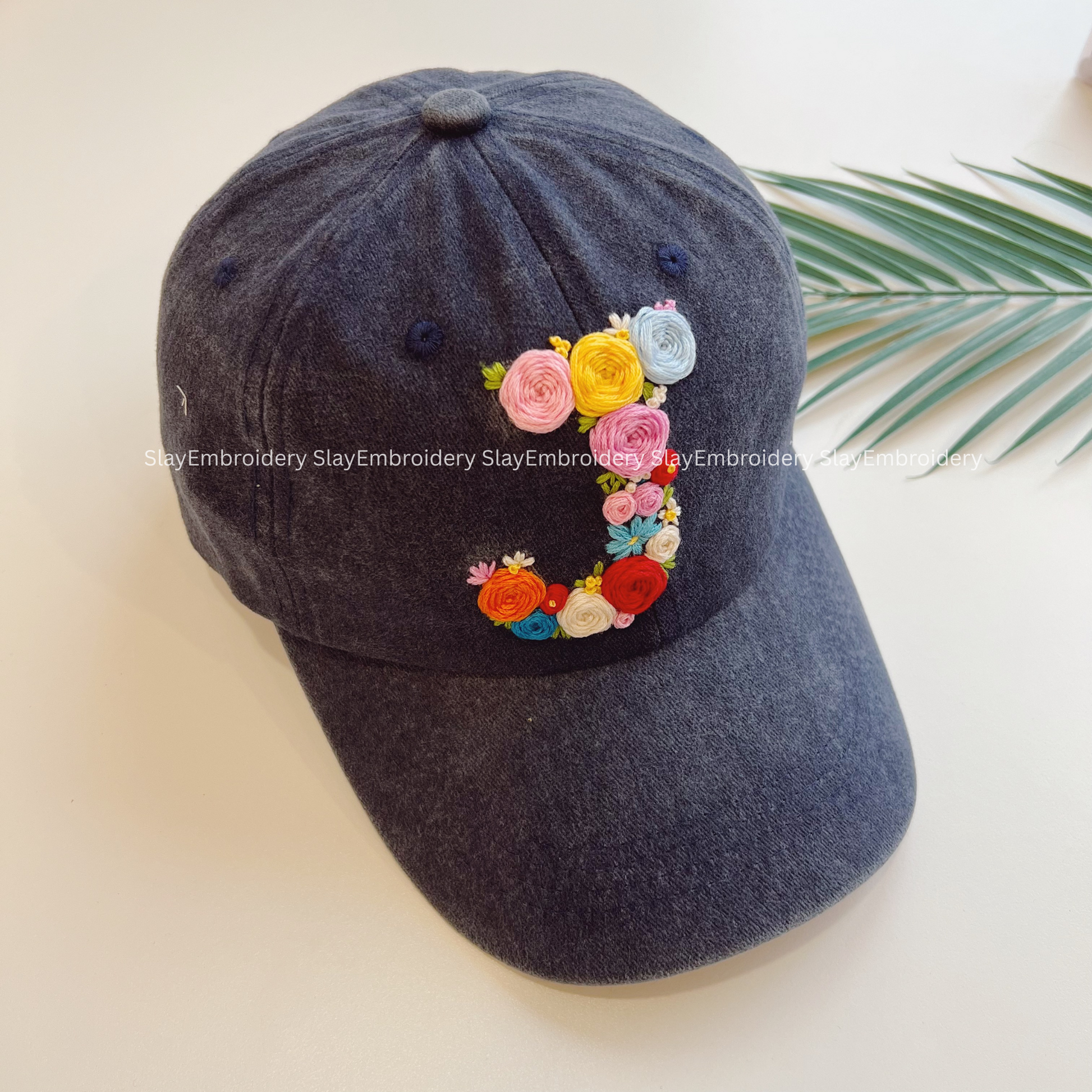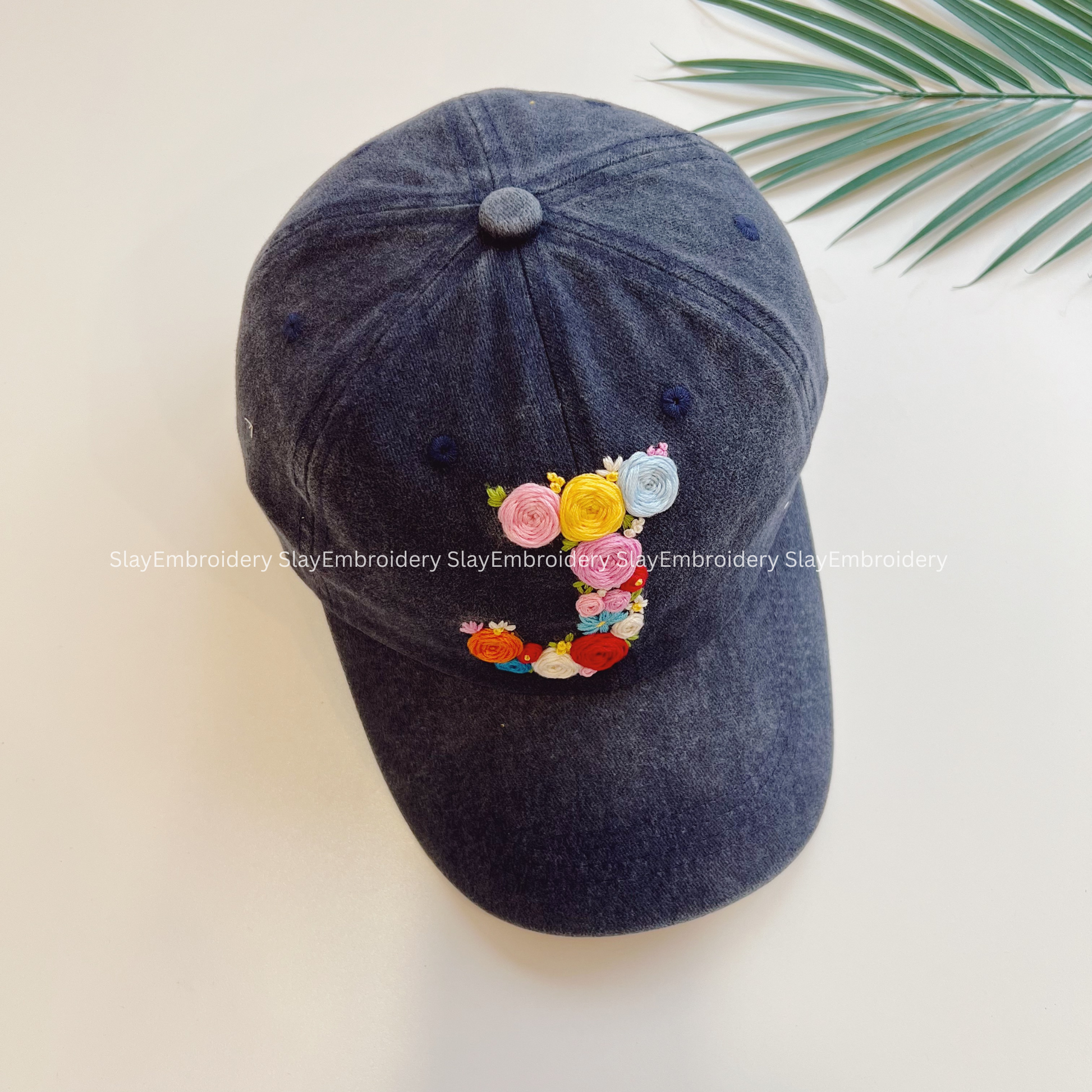 Floral "J" Summer Hand Embroidery Hat Vintage Hat Washed Baseball Cap