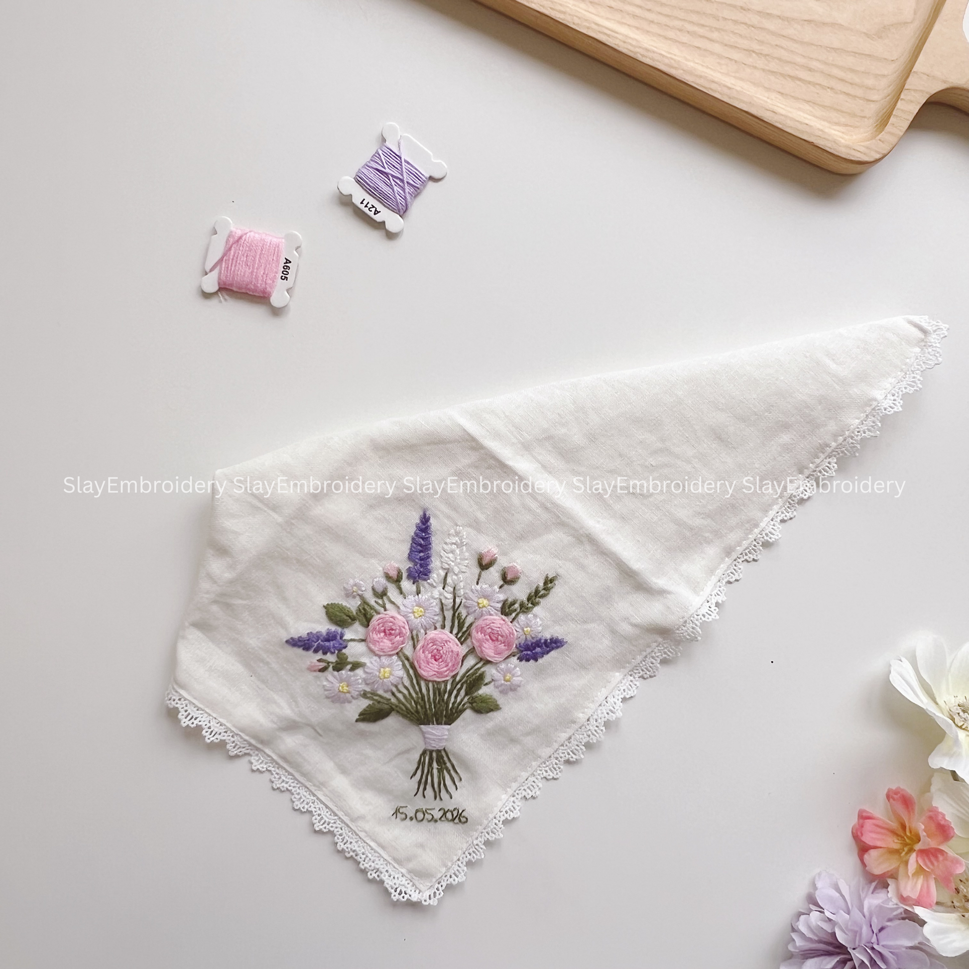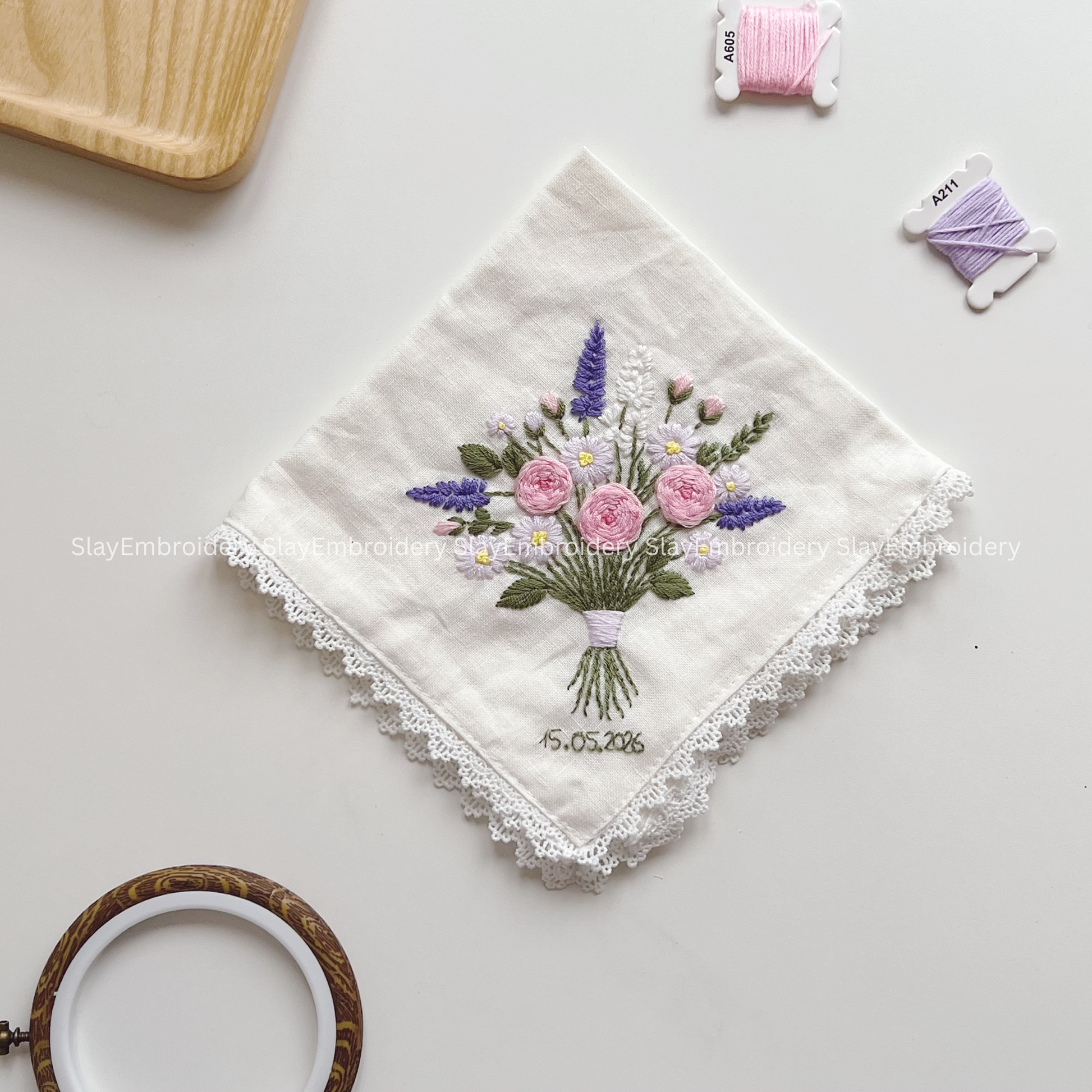 Flower Bouquet Wedding Handkerchief, Custom Embroidered Handkerchief, Linen Handkerchiefs