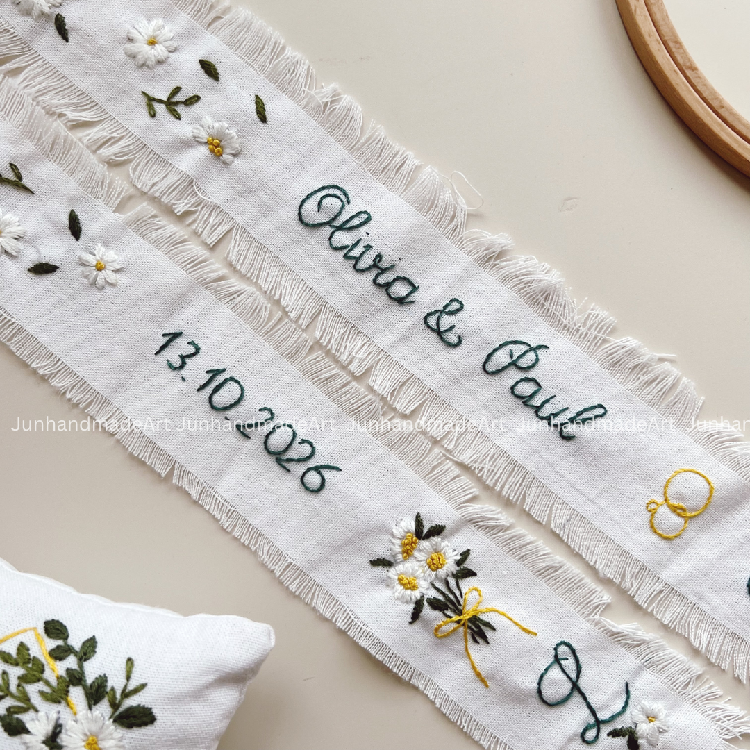 Lovely Daisies Embroidered Wedding Ribbon – Custom Linen Tie for Bouquet or Hair, Hand-stitched with Names & Date, Bridal Keepsake Gift