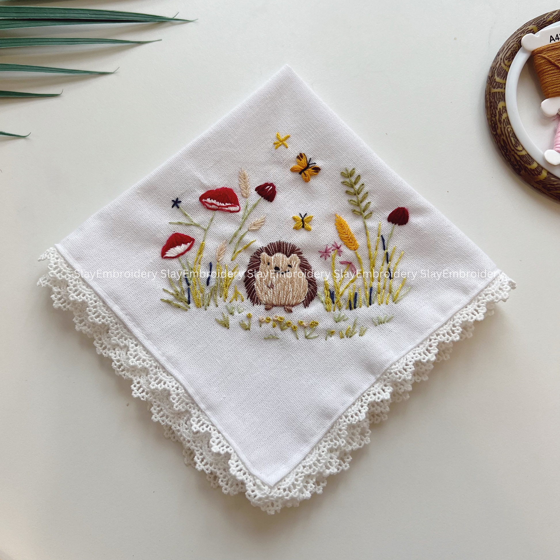 Hedgehog & Mushroom Wedding Handkerchief, Custom Embroidered Handkerchief, Linen Handkerchiefs