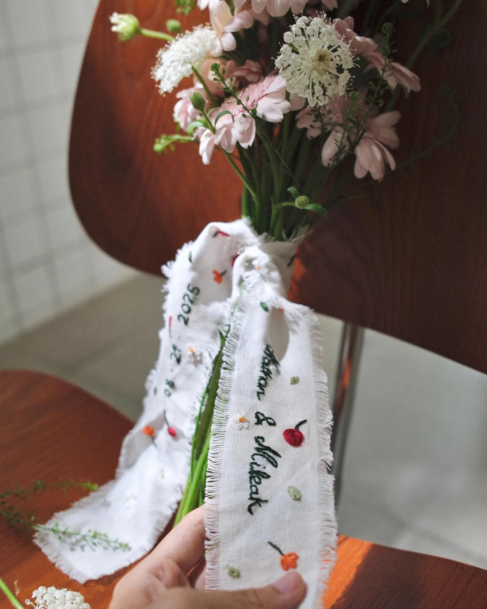 Personalized Embroidered Wedding Ribbon – Custom Linen Tie for Bouquet or Hair, Hand-stitched with Names & Date, Bridal Keepsake Gift