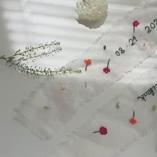 - Embroidery: Handmade with floral motifs, personalized with names and date