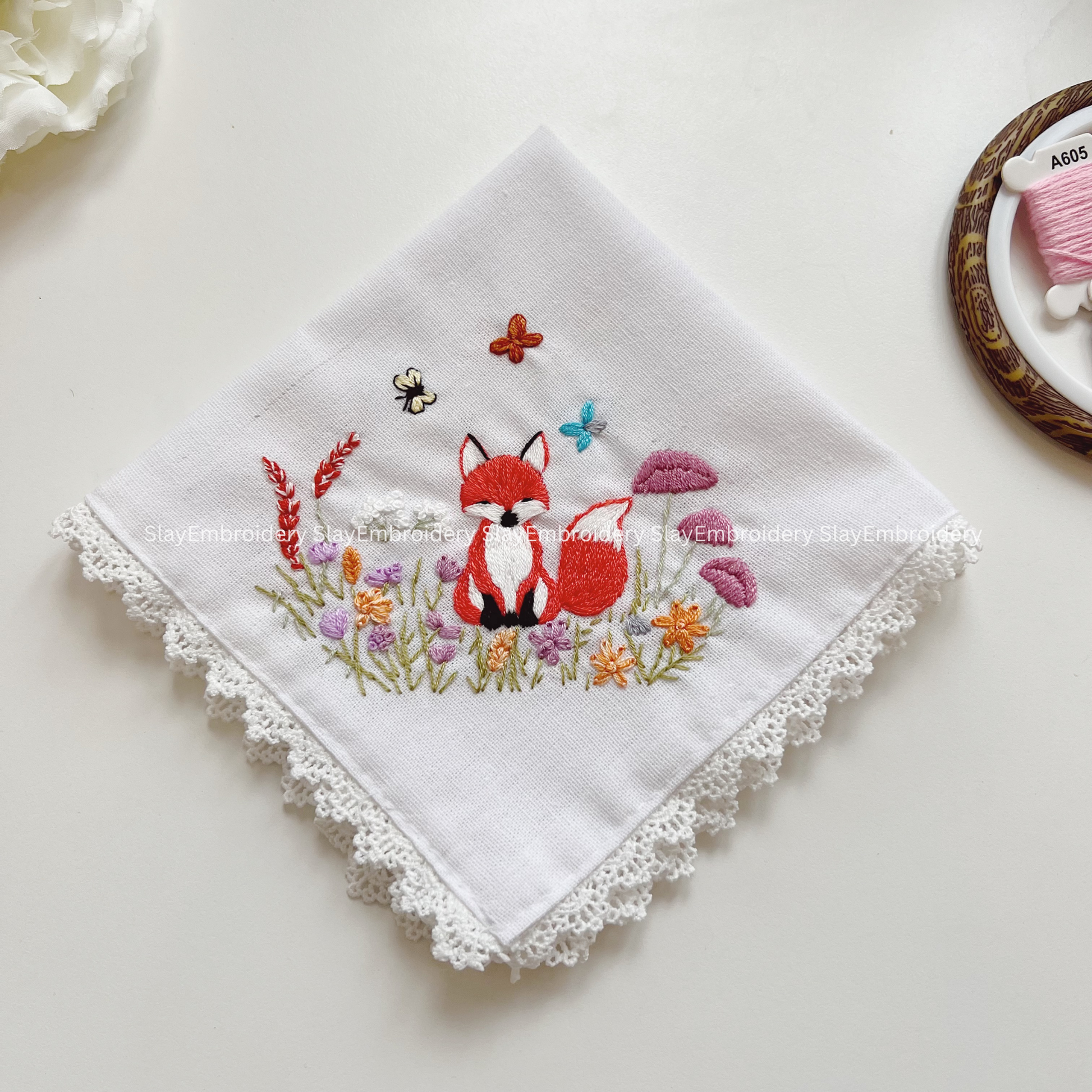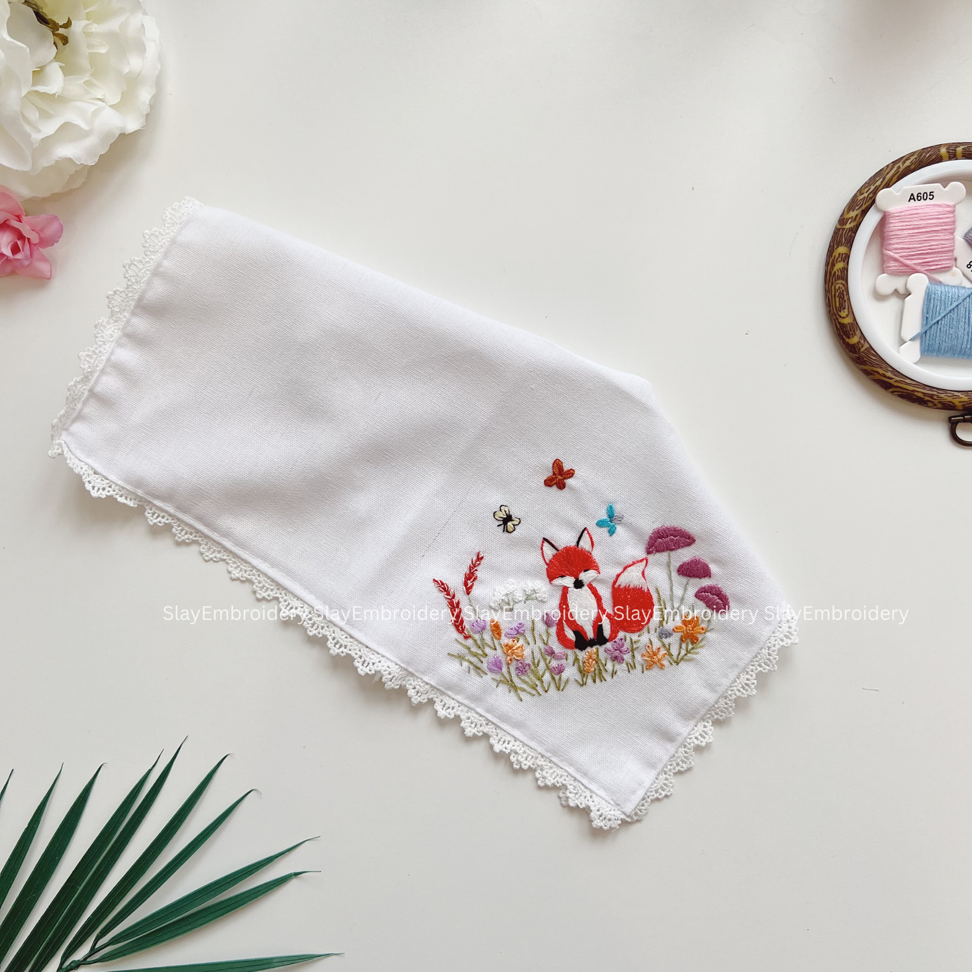 Fox & Flowers Wedding Handkerchief, Custom Embroidered Handkerchief, Linen Handkerchiefs