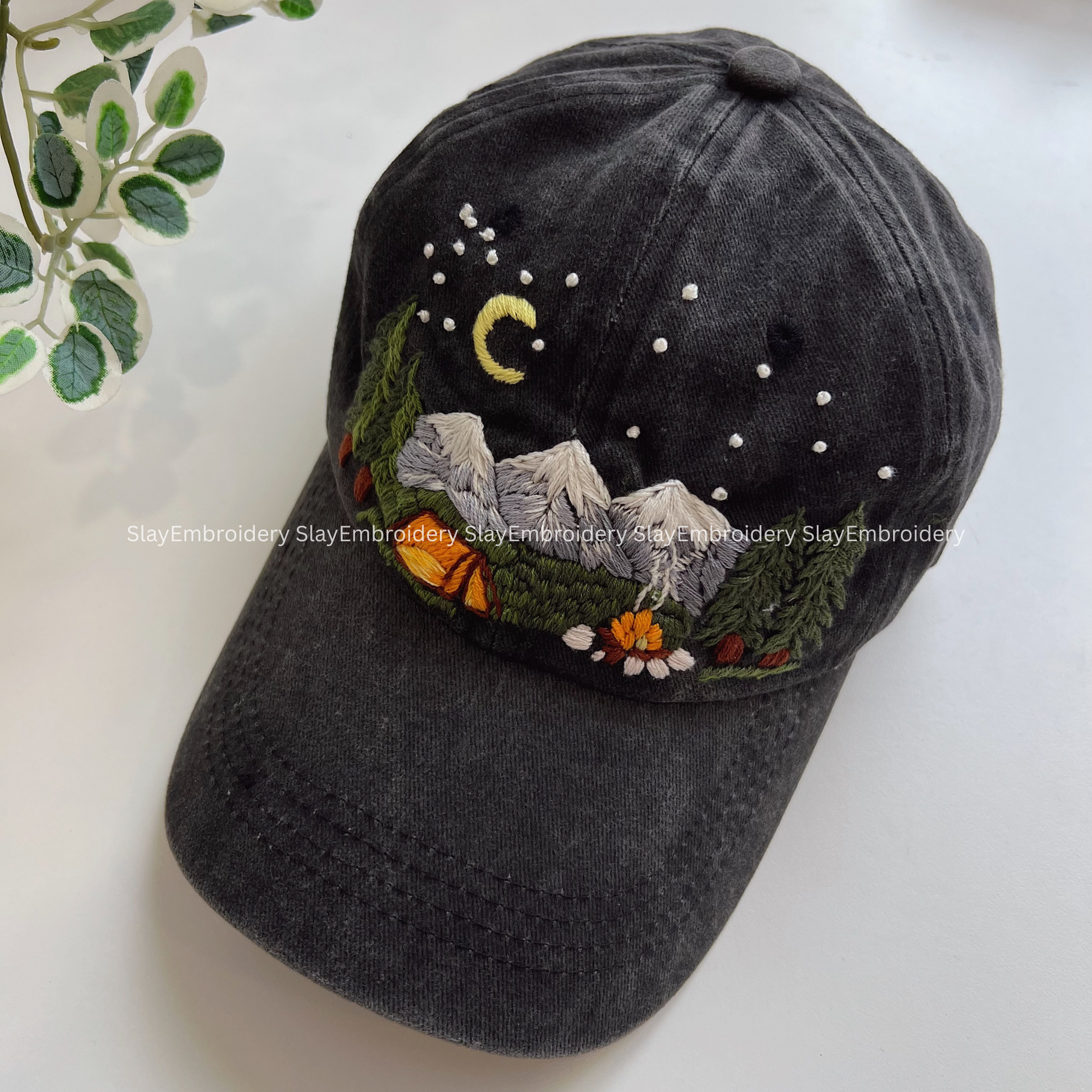 Night In The Mountains Summer Hand Embroidery Hat Vintage Hat Washed Baseball Cap
