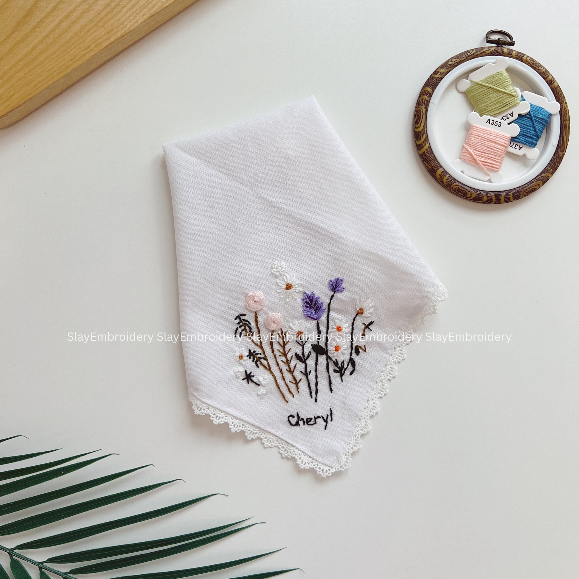 Meadow Bloom Wedding Handkerchief, Custom Embroidered Handkerchief, Linen Handkerchiefs