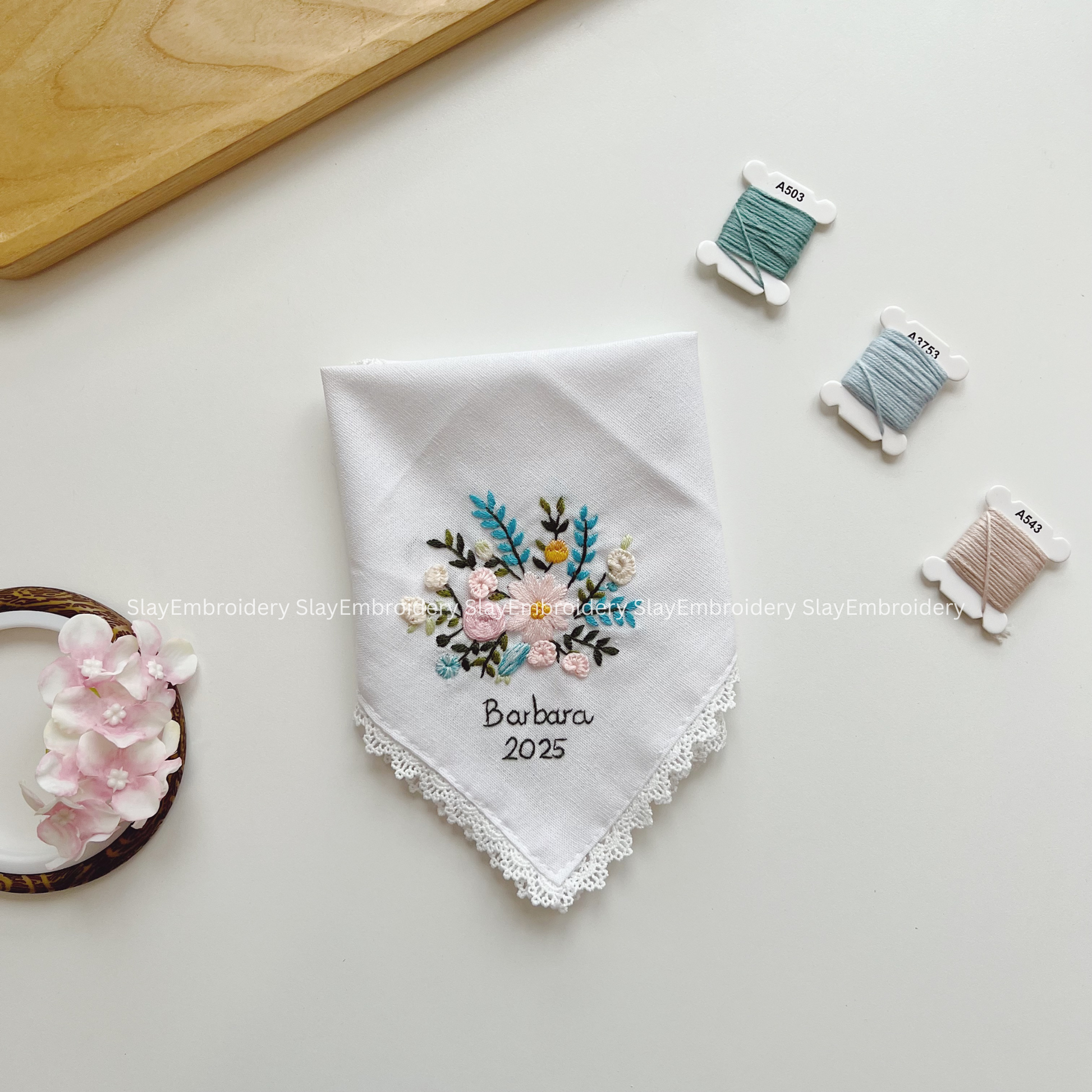 Rosy Meadow Wedding Handkerchief, Custom Embroidered Handkerchief, Linen Handkerchiefs