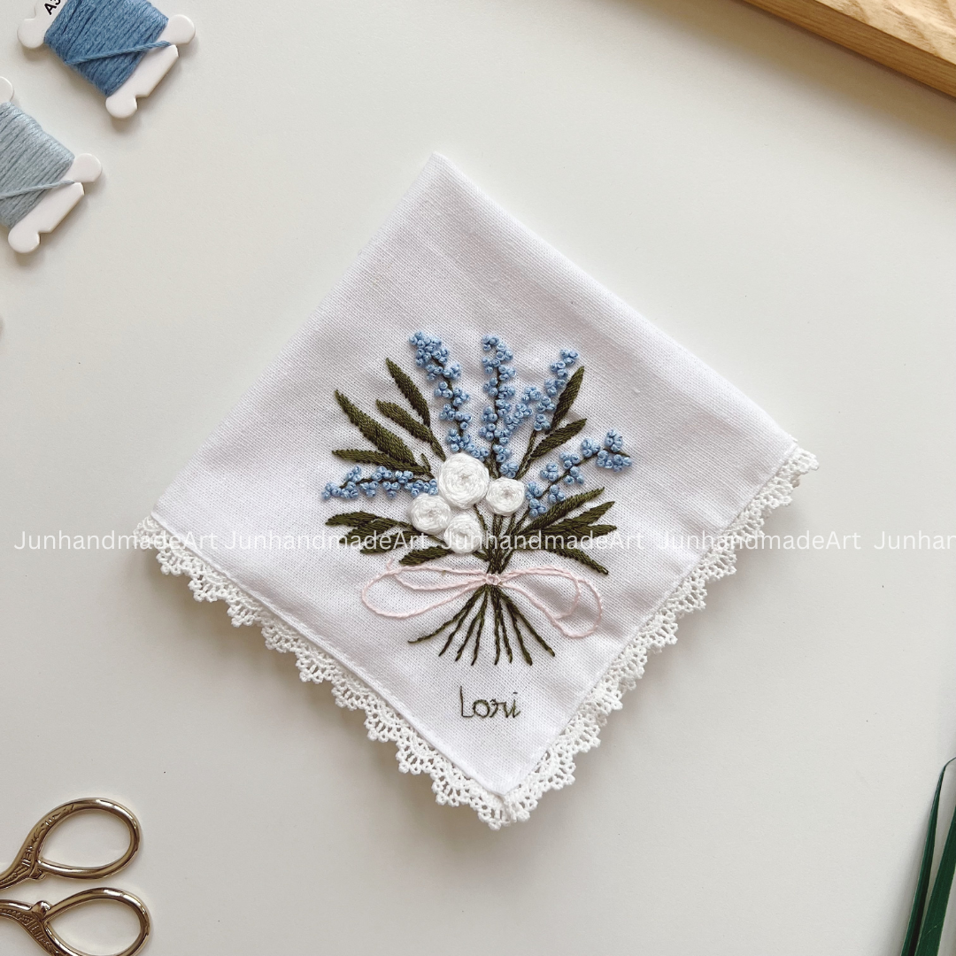 White and Green Flower Bouquet Handkerchief, Custom Embroidered Handkerchief, Linen Handkerchiefs