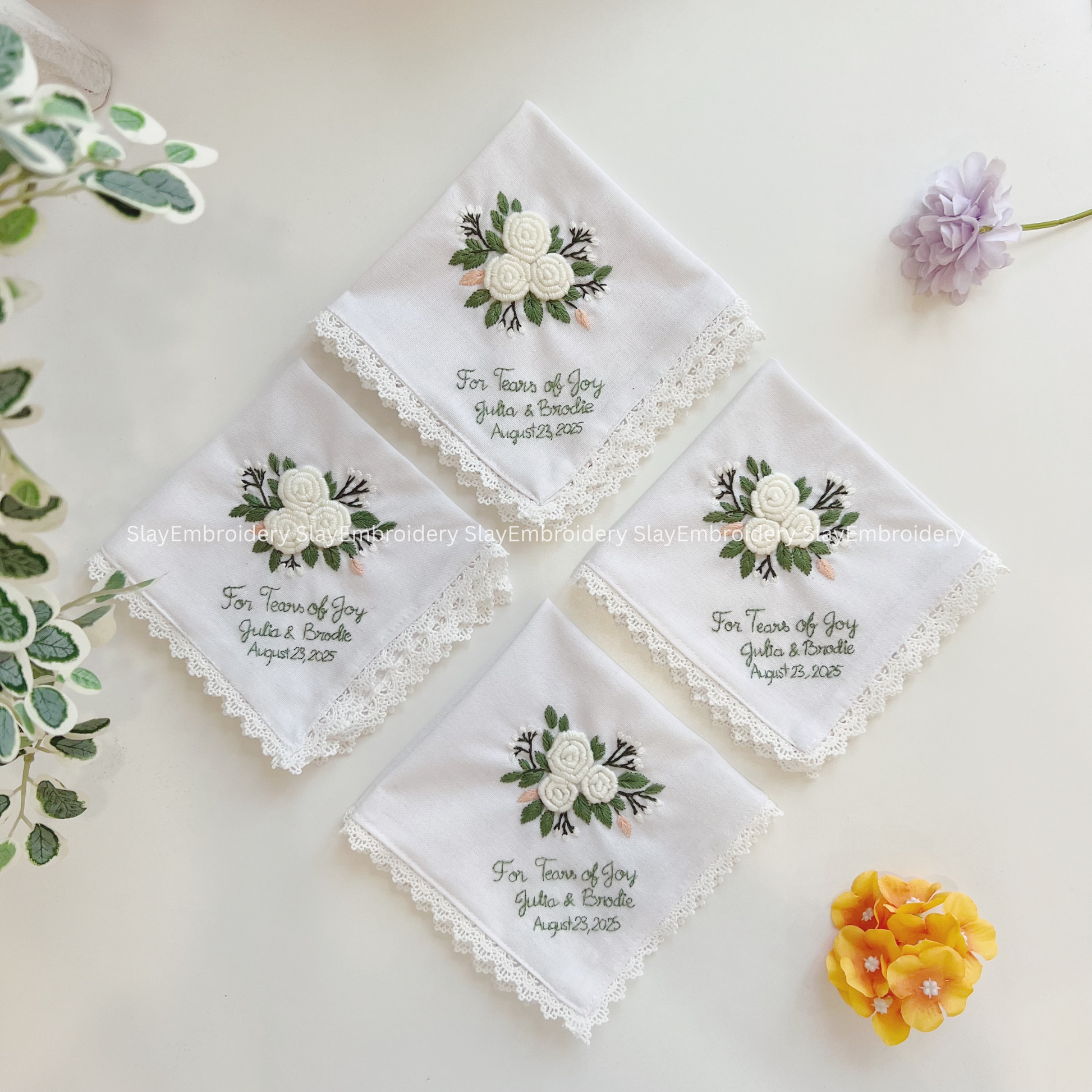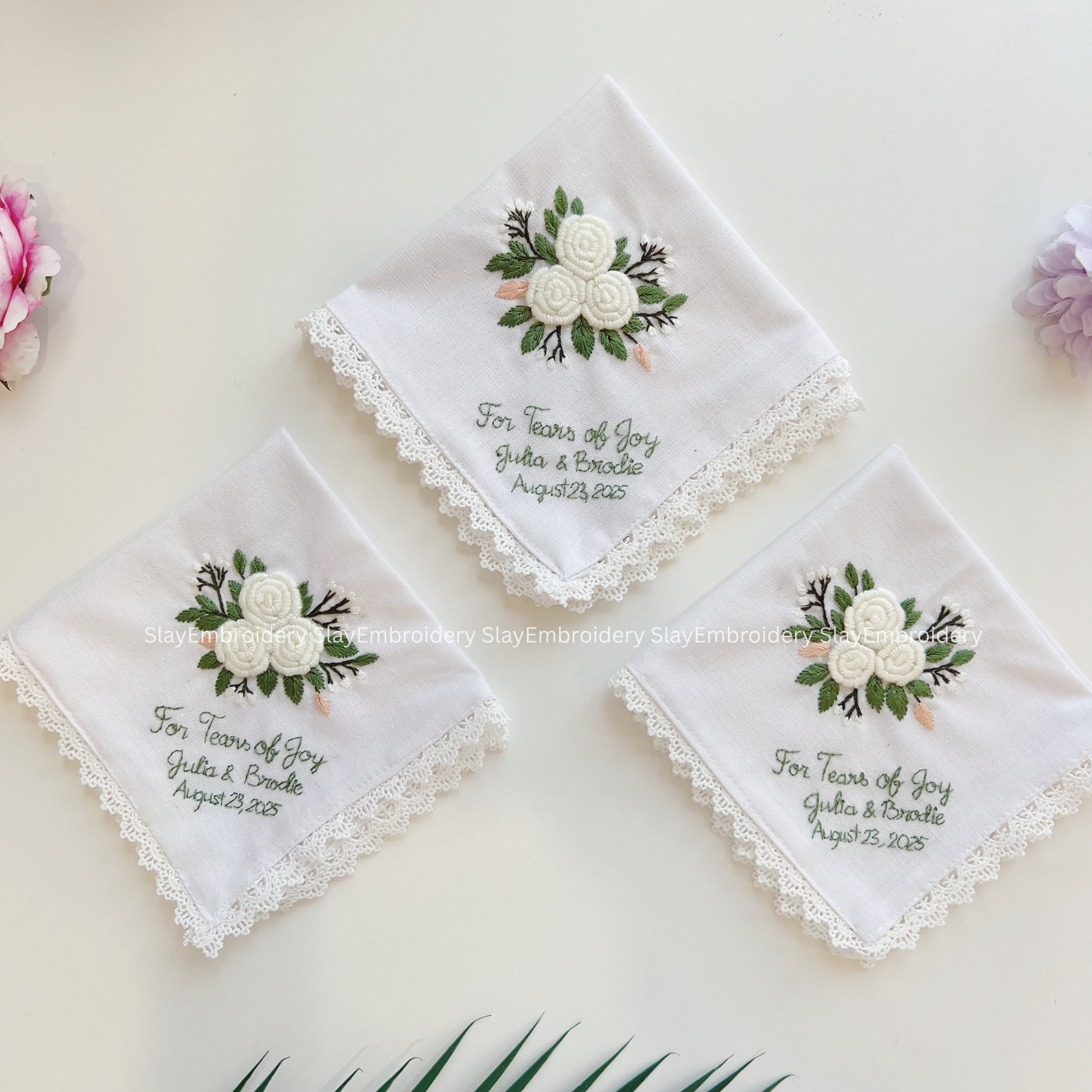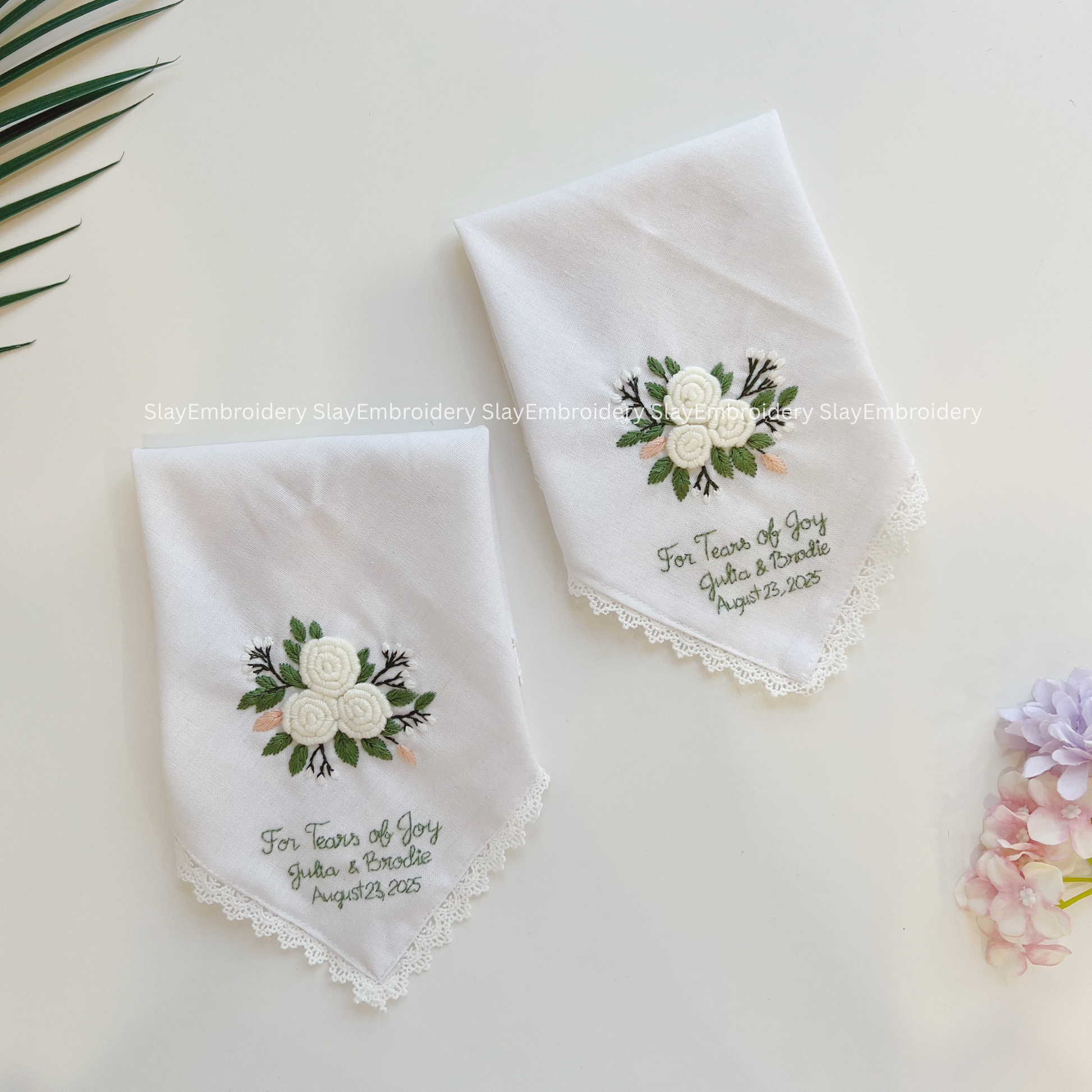 White Rose Garden Wedding Handkerchief, Custom Embroidered Handkerchief, Linen Handkerchiefs