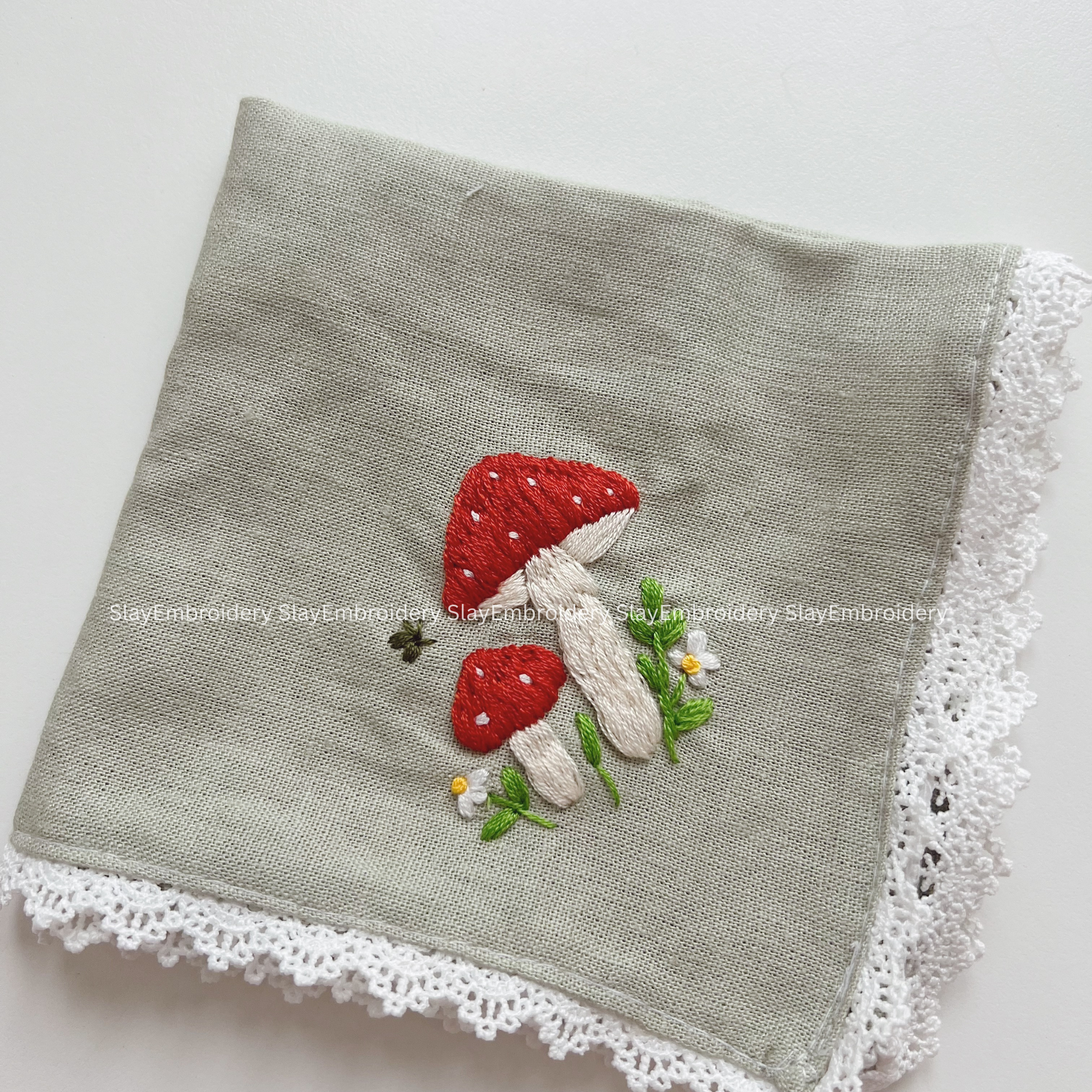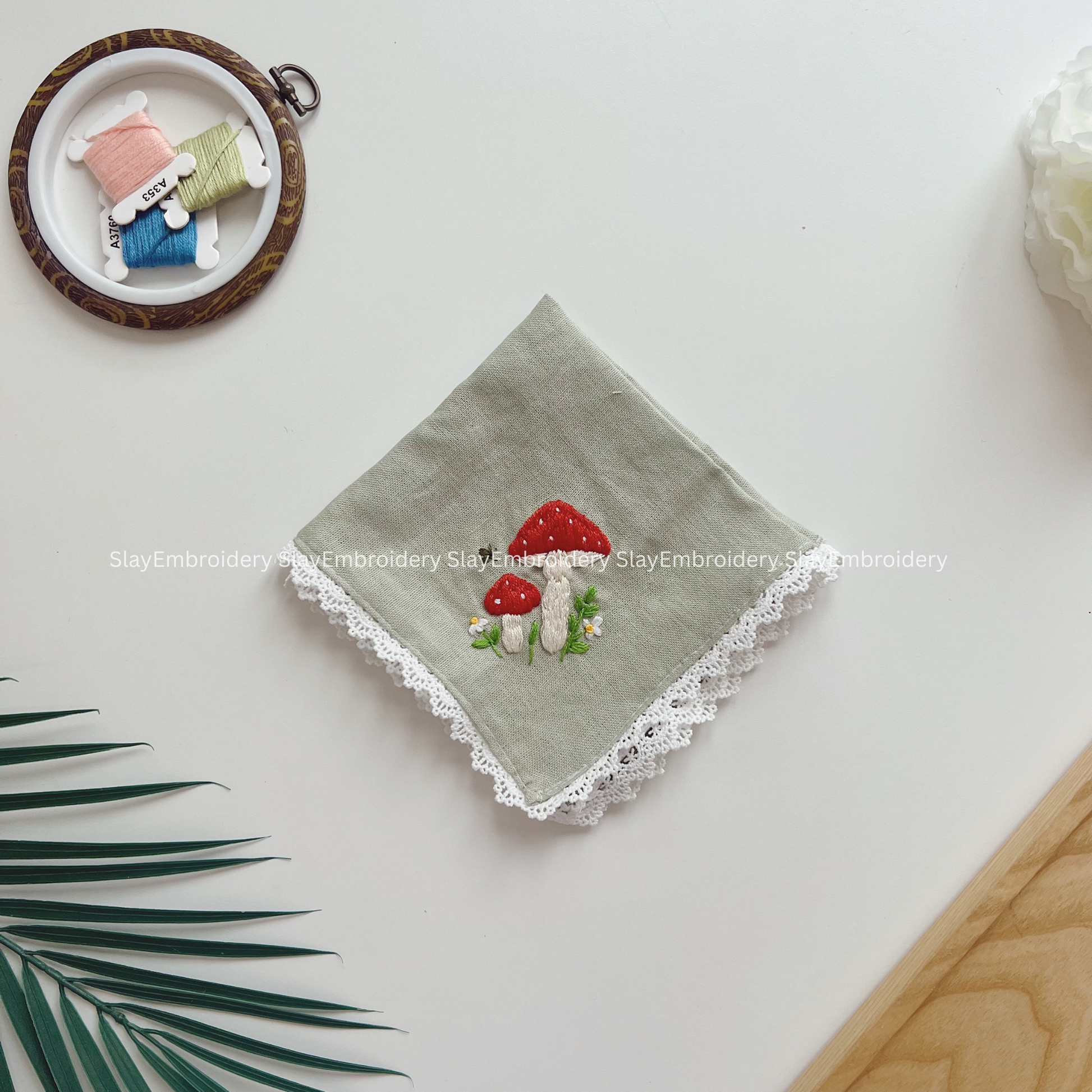 Under The Mushrooms Wedding Handkerchief, Custom Embroidered Handkerchief, Linen Handkerchiefs