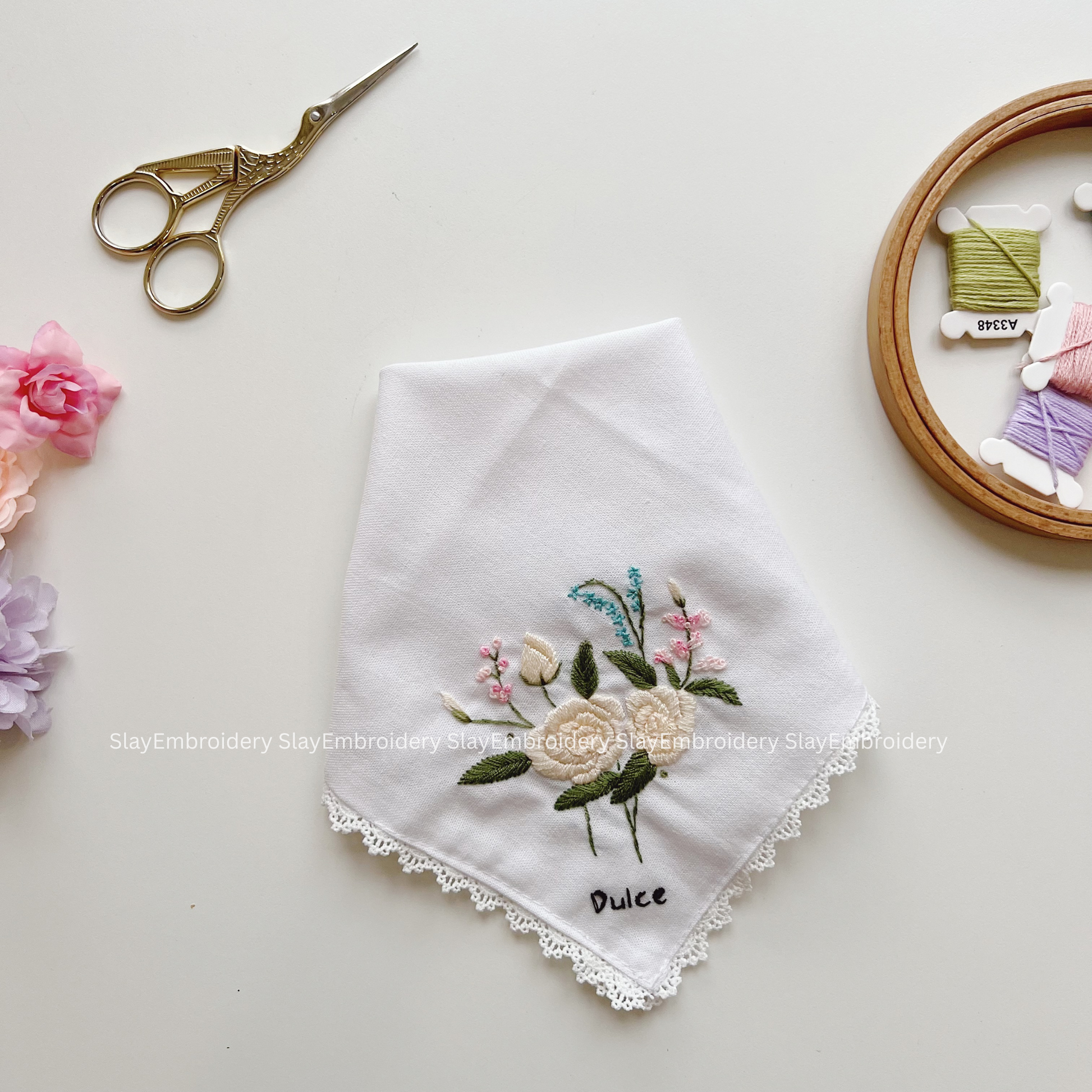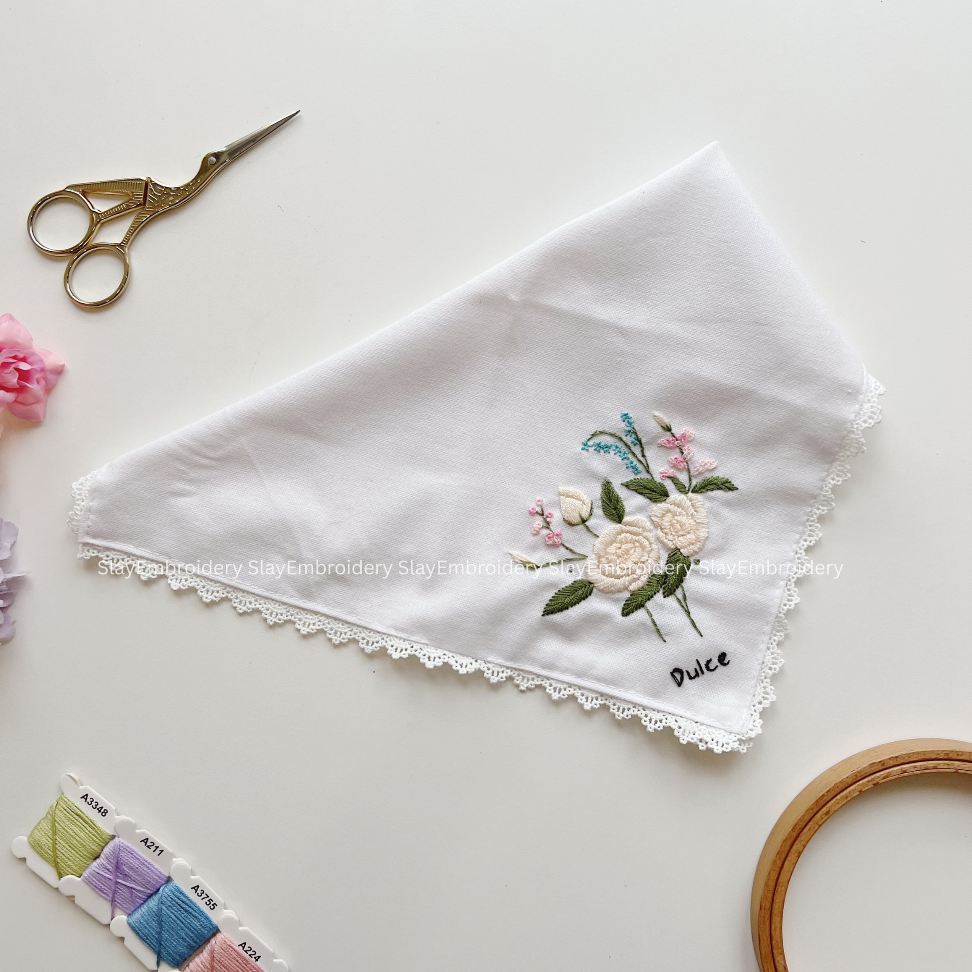 White Roses Wedding Handkerchief, Custom Embroidered Handkerchief, Linen Handkerchiefs